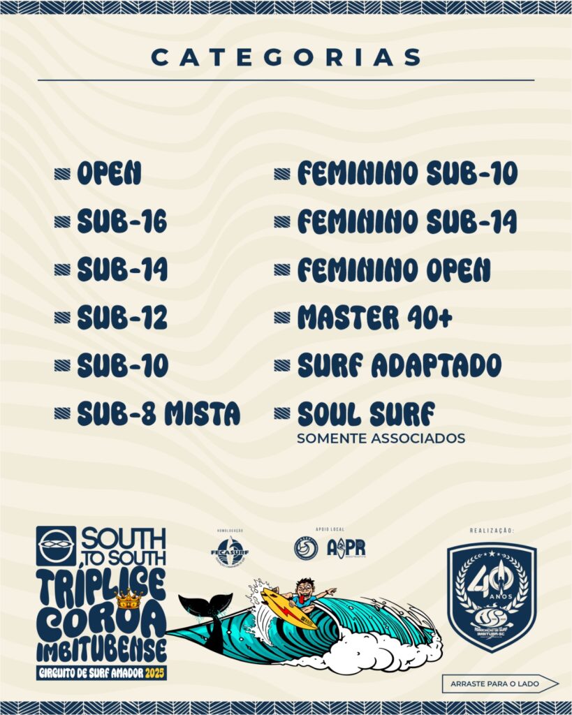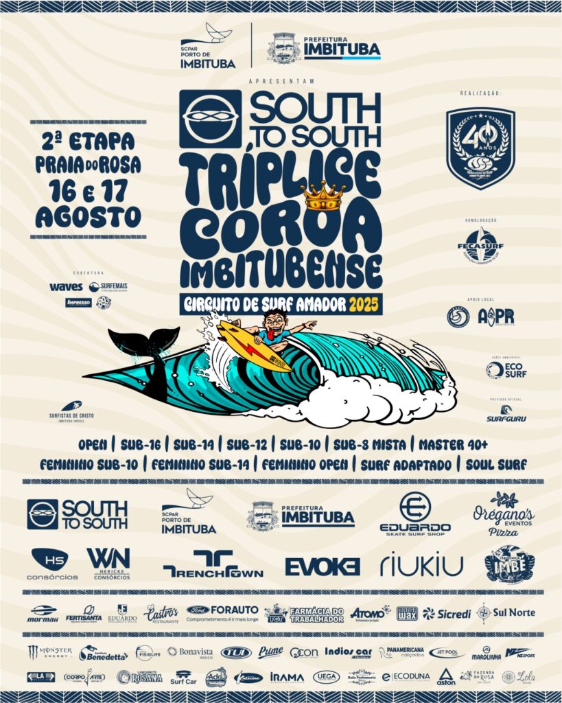 O South to South Tríplice Coroa de Surf Imbitubense 2025 chega a praia do Rosa, em Imbituba, nos próximos dias 16 e 17 de agosto, e Lucas Costa e Victoria Valenzano defendem a liderança do circuito na categoria Open masculino e feminino. A ASI em 2025 comemora seus 40 anos de fundação e as inscrições já estão abertas.