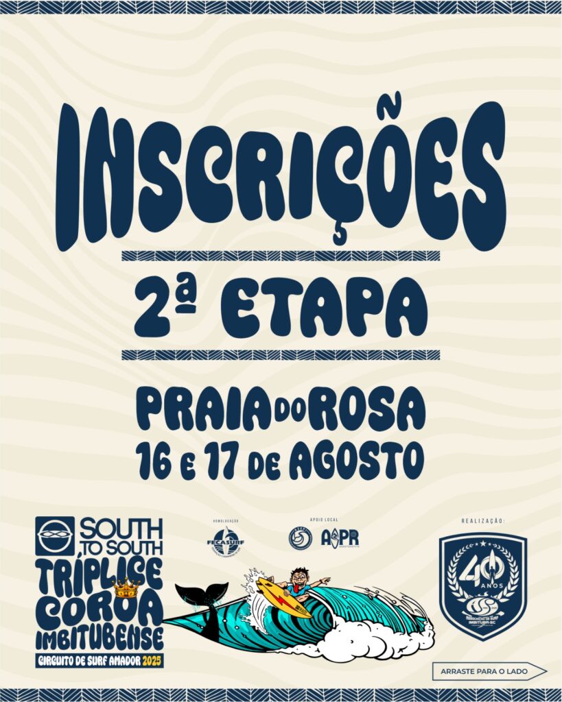 Nos próximos dias 16 e 17 de agosto, a paradisíaca praia do Rosa, em Imbituba, será palco da 2ª etapa do South to South Tríplice Coroa de Surf Imbitubense 2025, que será apresentado por SCPar Porto de Imbituba e Prefeitura Municipal de Imbituba, e dará continuidade as comemorações para os 40 anos de fundação da Associação de Surf Imbitubense (ASI).