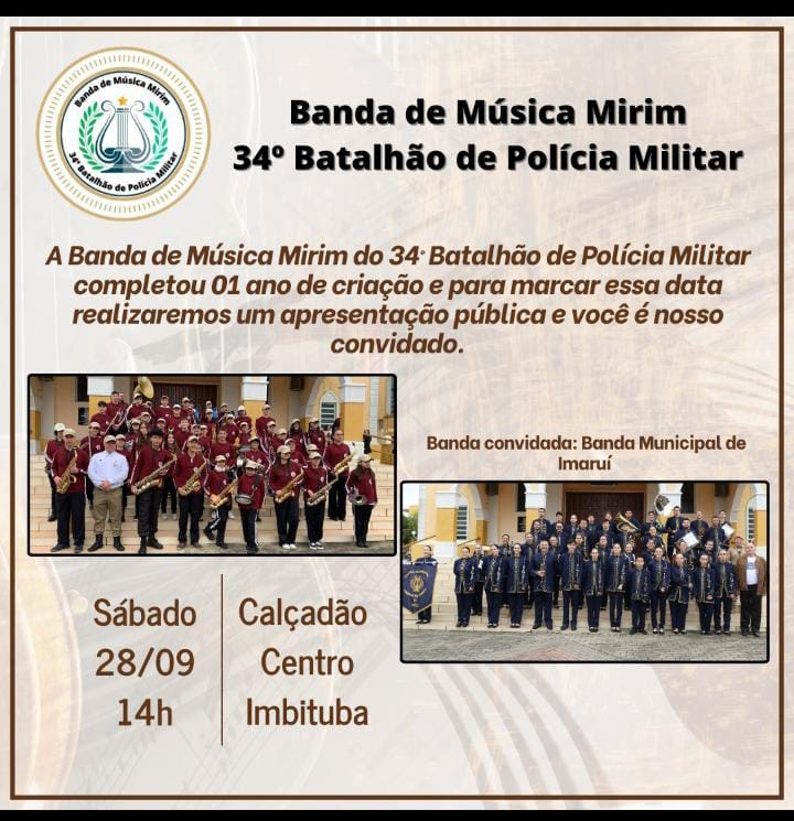 A Banda de Música Mirim do 34º Batalhão de Polícia Militar de Imbituba completará um ano de existência. E para celebrar essa data especial fará apresentação pública no próximo dia 28, às 14h, no Calçadão da Rua Nereu Ramos, no Centro de Imbituba.