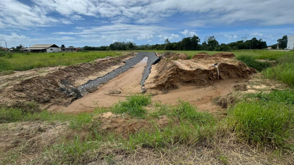 Segundo a empresa, já foram instaladas barreiras de contenção para evitar o carreamento de solo e reduzir a velocidade da água. A ViaCosteira também sustenta que o trecho apresentava acúmulo de água por causa da configuração do terreno e que, após a execução da primeira etapa do canal, o fluxo seguiu o “caminho natural” da área.