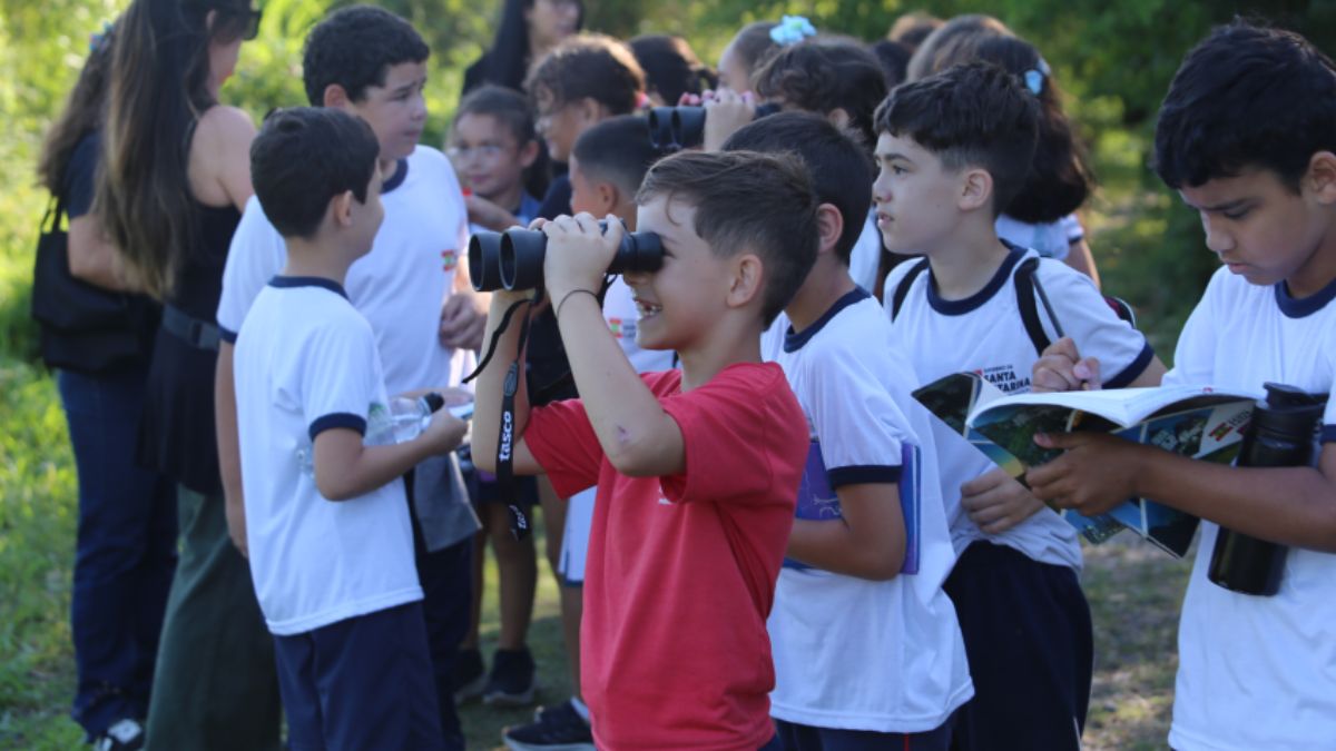 Com binóculos e acompanhamento técnico, os estudantes dos períodos matutino e vespertino percorreram uma trilha interpretativa e puderam conhecer espécies de aves que vivem na região, além de aprender sobre a importância do ecossistema costeiro para a cidade.