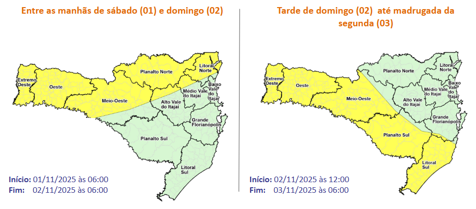 A instabilidade começa a ganhar força a partir da tarde de sábado, avançando pelas áreas de divisa com o Paraná e se concentrando entre o Grande Oeste e o norte catarinense até a manhã de domingo. Já entre a tarde do domingo e a madrugada de segunda (3), a chuva se desloca em direção ao Sul do estado, com possibilidade de temporais isolados nas regiões próximas à divisa com o Rio Grande do Sul.