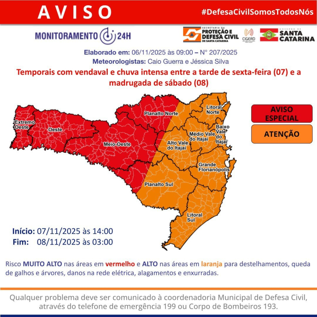 A Defesa Civil de Santa Catarina emitiu um novo alerta para a tarde desta sexta-feira (07) e sábado (08) para a região da Amurel. Devido a aproximação de uma frente fria e a atuação de um ciclone extratropical, os ventos podem chegar a 100 km/h e volumes de chuva entre 30 e 60 milímetros, com riscos de alagamentos, destelhamentos e queda de árvores e enxurradas.