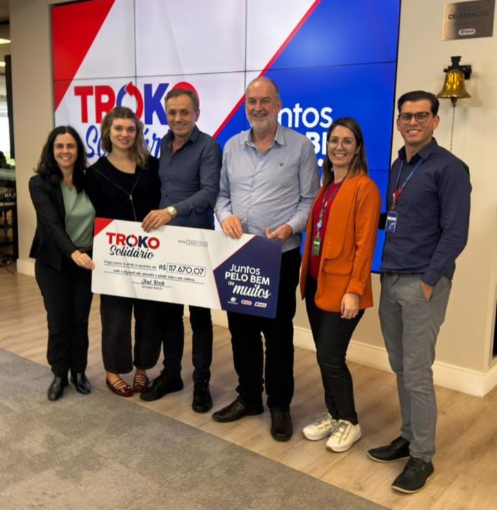 O Grupo Koch realizou a entrega de R$ 117.670,07 à Federação das APAEs de Santa Catarina (FEAPAES-SC) nesta segunda-feira (20), resultado da terceira etapa do projeto Troko Solidário de 2025 (já foram repassados neste ano mais de R$ 380 mil para a instituição). O valor será distribuído entre as APAEs dos 35 municípios onde o Grupo Koch atua, do Planalto Norte ao Sul do estado, fortalecendo ações voltadas à inclusão e ao desenvolvimento de pessoas com deficiência.