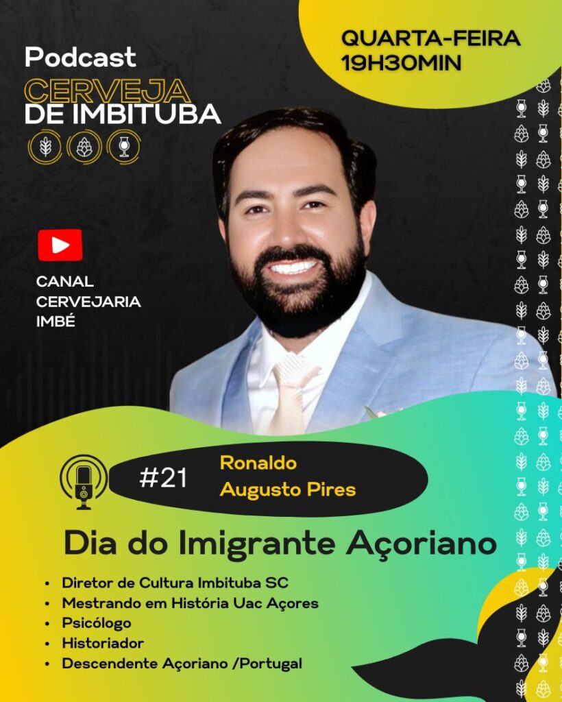 O podcast Cerveja de Imbituba está de volta — e com tudo! O aguardado retorno acontece nesta quarta-feira (06), às 19h30, com transmissão ao vivo pelo YouTube da Cervejaria Imbé. E para marcar a reestreia, o convidado do episódio #21 é o psicólogo, historiador e Diretor Municipal de Cultura de Imbituba, Ronaldo Augusto Pires, que chega para celebrar o Dia do Imigrante Açoriano e contar histórias que fortalecem o elo entre o passado e o presente da identidade cultural local, sem deixar de abrir o baú de muitas atividades que ele já fez nos 49 anos de vida.
