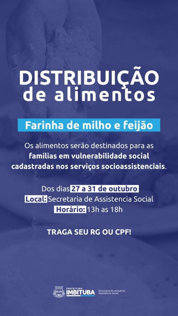 A Prefeitura de Imbituba publicou uma nota de esclarecimento para a imprensa, nesta sexta-feira (24), referente à circulação de uma imagem nas redes sociais sobre a distribuição de alimentos pela Secretaria de Assistência Social do município. Na imagem, o órgão público comunica que, nos dias 27 e 31 de outubro, das 13h as 18h, realizará a distribuição de pacotes de farinha de milho e de feijão à população em vulnerabilidade social.