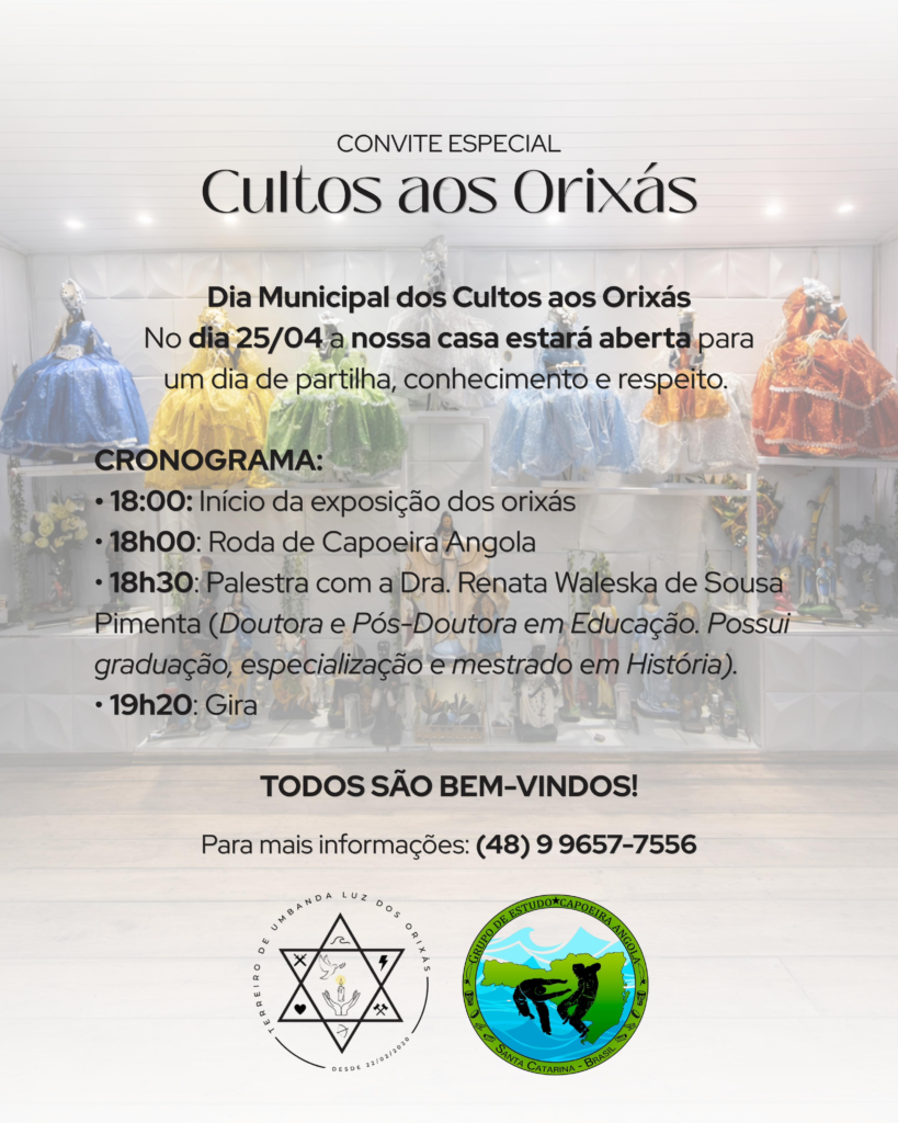Para celebrar o Dia Municipal dos Cultos aos Orixás de Imbituba, o terreiro Luz dos Orixás vai realizar, no próximo sábado (25), a partir das 18h, uma noite de religiosidade, cultura e fé. Além da própria gira, a programação contará com exposição, palestra, educação e trabalhos energéticos gratuitos para ampliar a visão da população do que são as religiões de matriz africana.